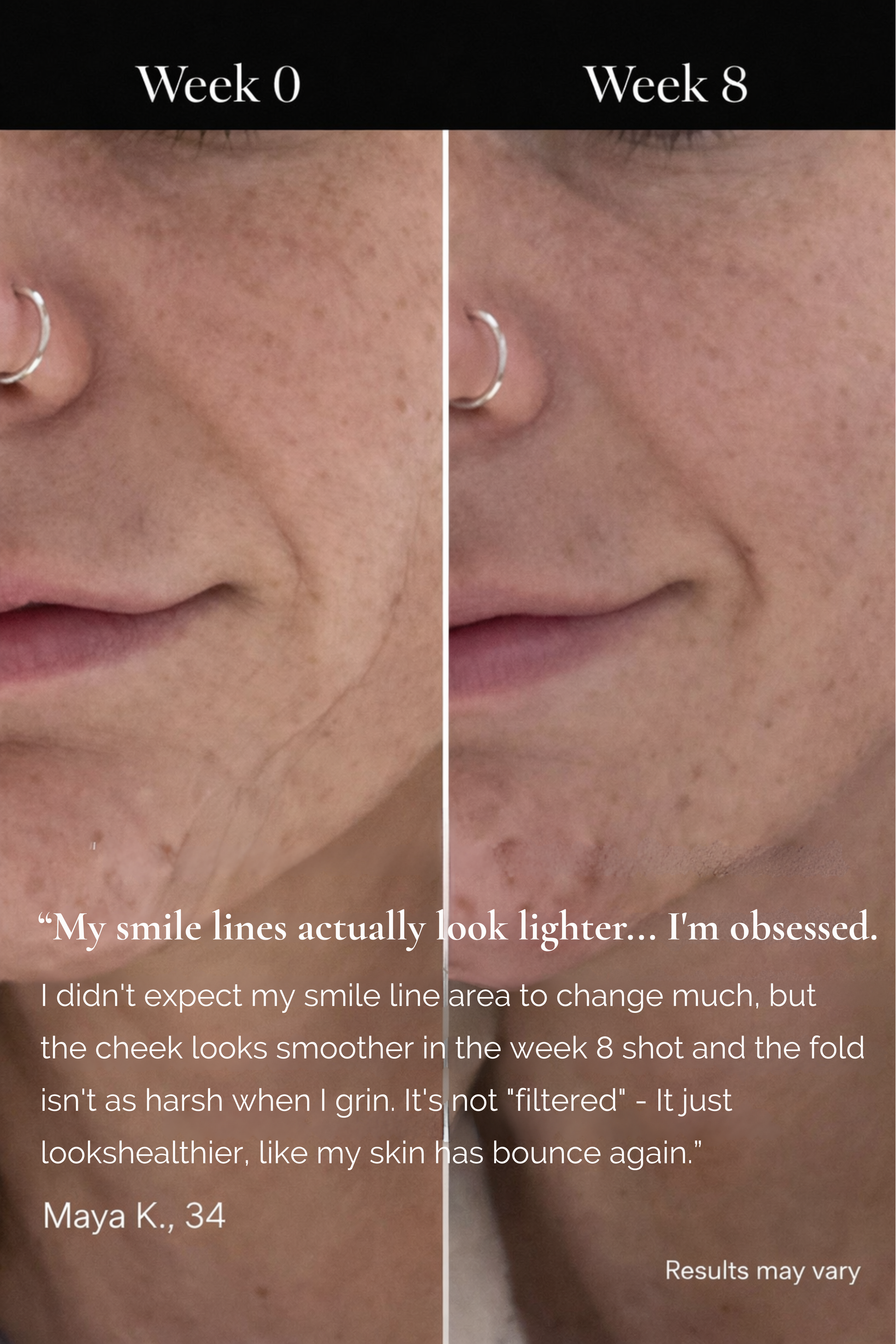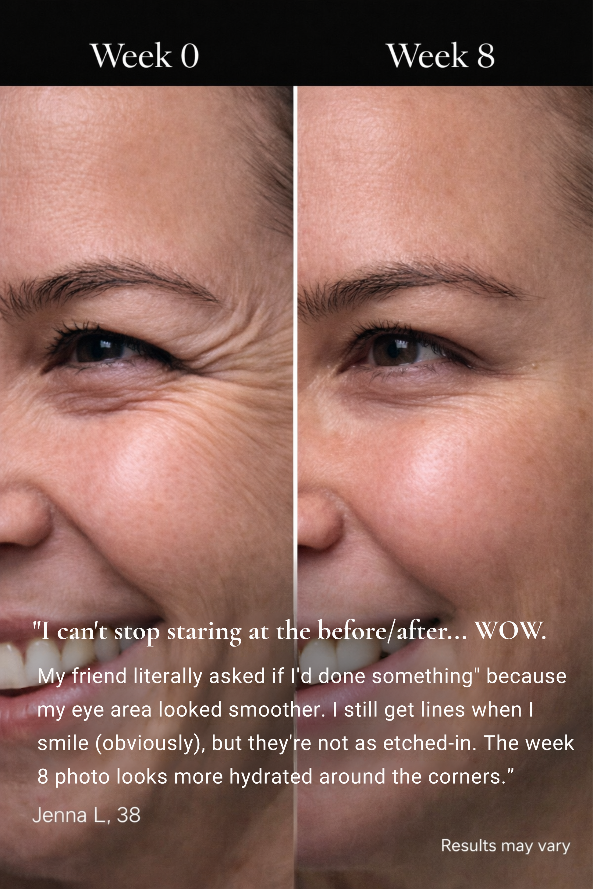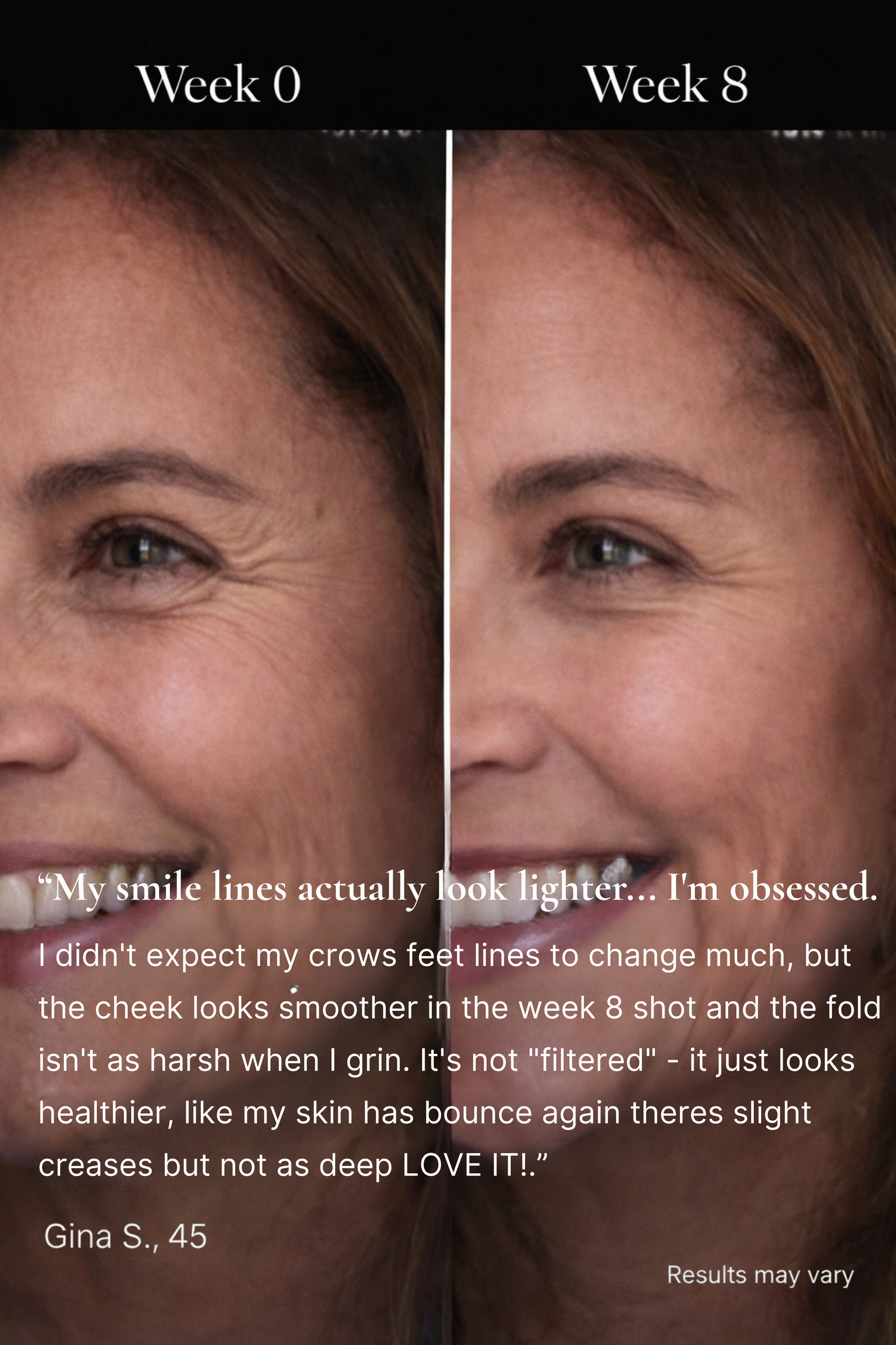 I stopped wearing my glasses to avoid seeing my wrinkles. Sounds dramatic but it's true. These patches gave me the courage to actually look at myself again. My smile lines and crow's feet have softened beautifully over 8 weeks.